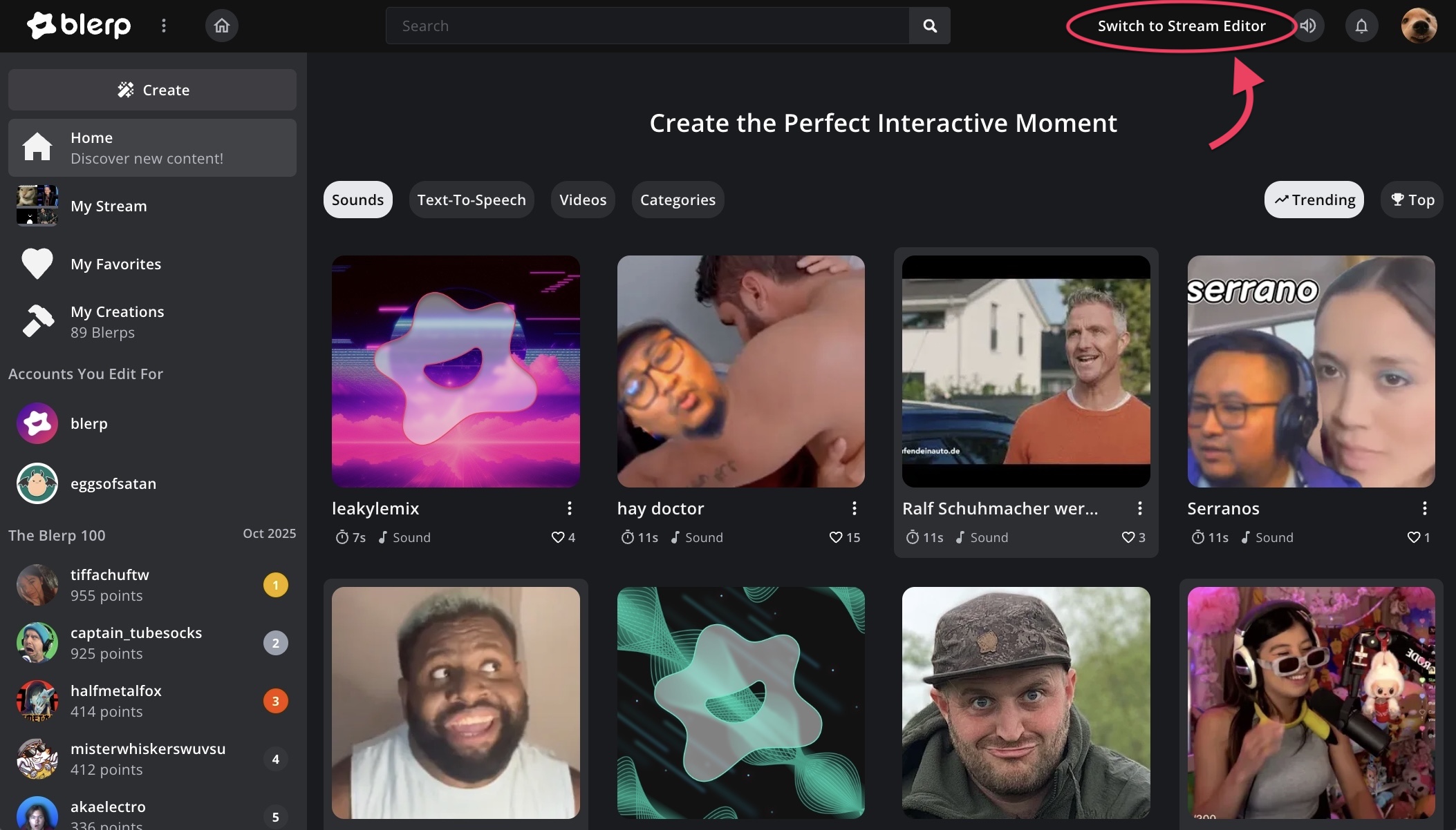 Go to Blerp and log in with your Twitch account. Once inside, click “Switch to Stream Editor.”