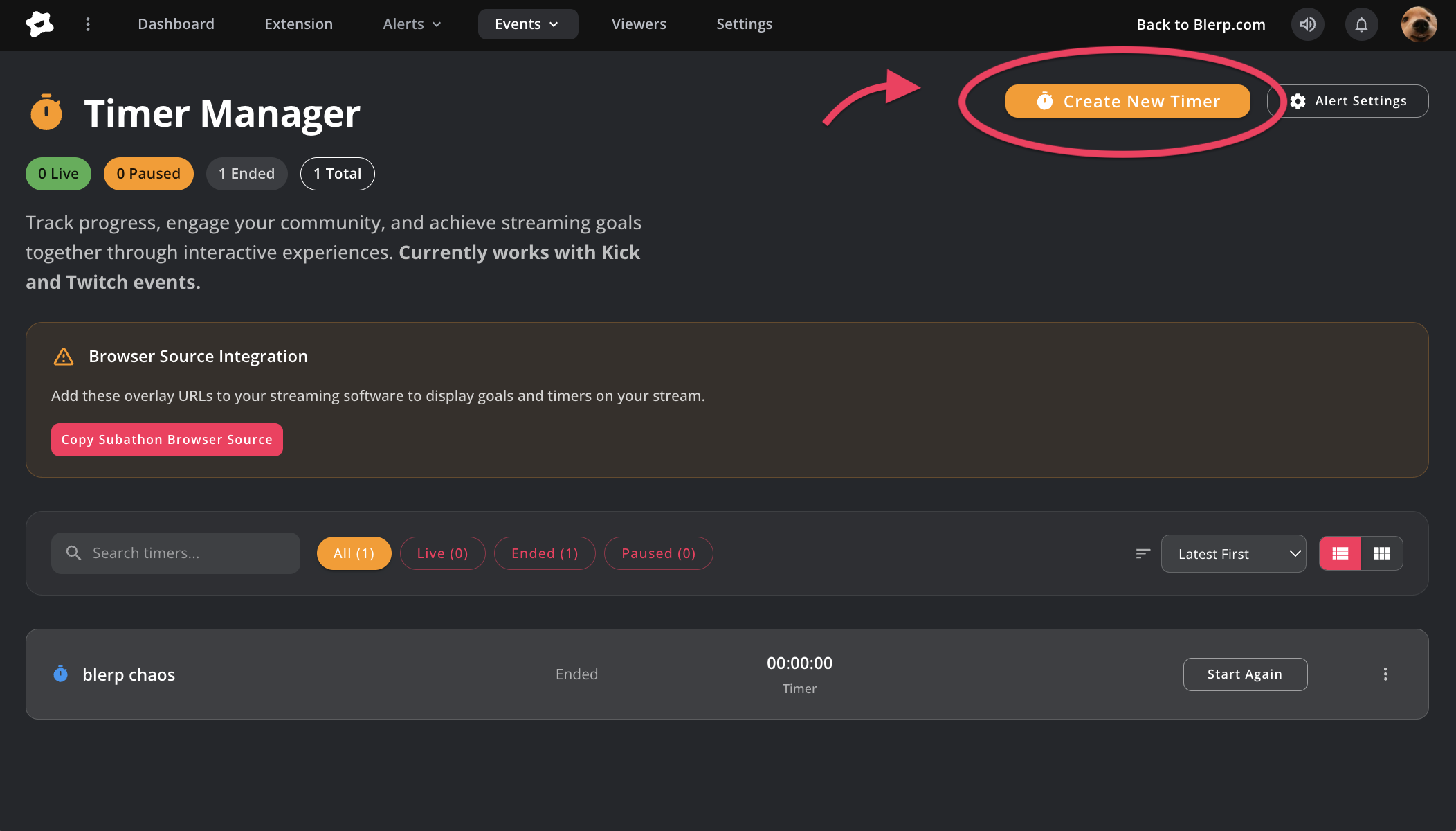 Once your timer is set, copy the browser source URL that Blerp generates. Paste this into OBS or Streamlabs as a browser source to display your Subathon Timer directly on your Twitch stream.