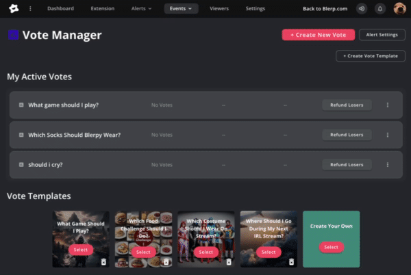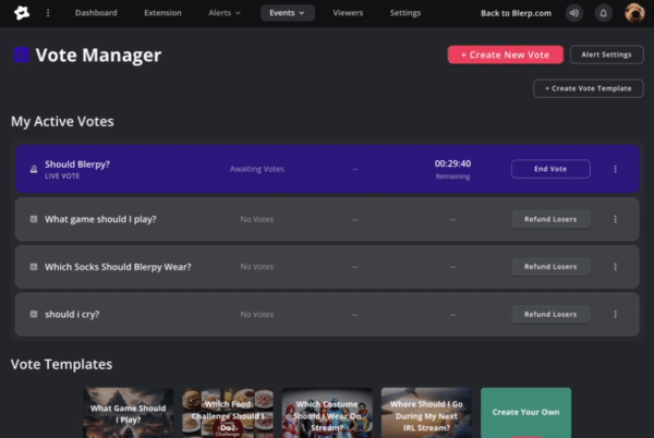 Want to give your viewers a voice in your stream? Blerp Votes lets your audience cast votes using Bits or Beets, directly influencing what happens next. Whether you’re letting them pick a game, choose your next move, or decide your on-stream costume, Votes bring interactive decision-making to your content.